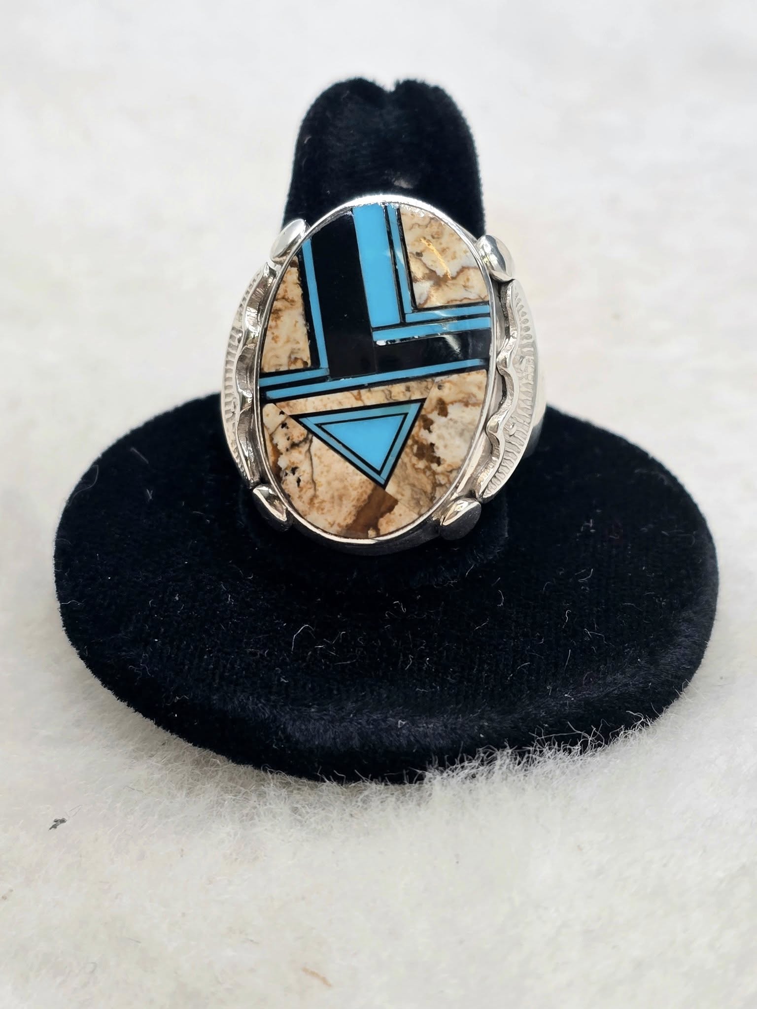 Man's inlaid ring made with picture Jasper, Turquoise, and Black Jet. Handmade by Zuni Tribe. Hallmarked A and Sterling. Size 12 and it measures 1"x1".