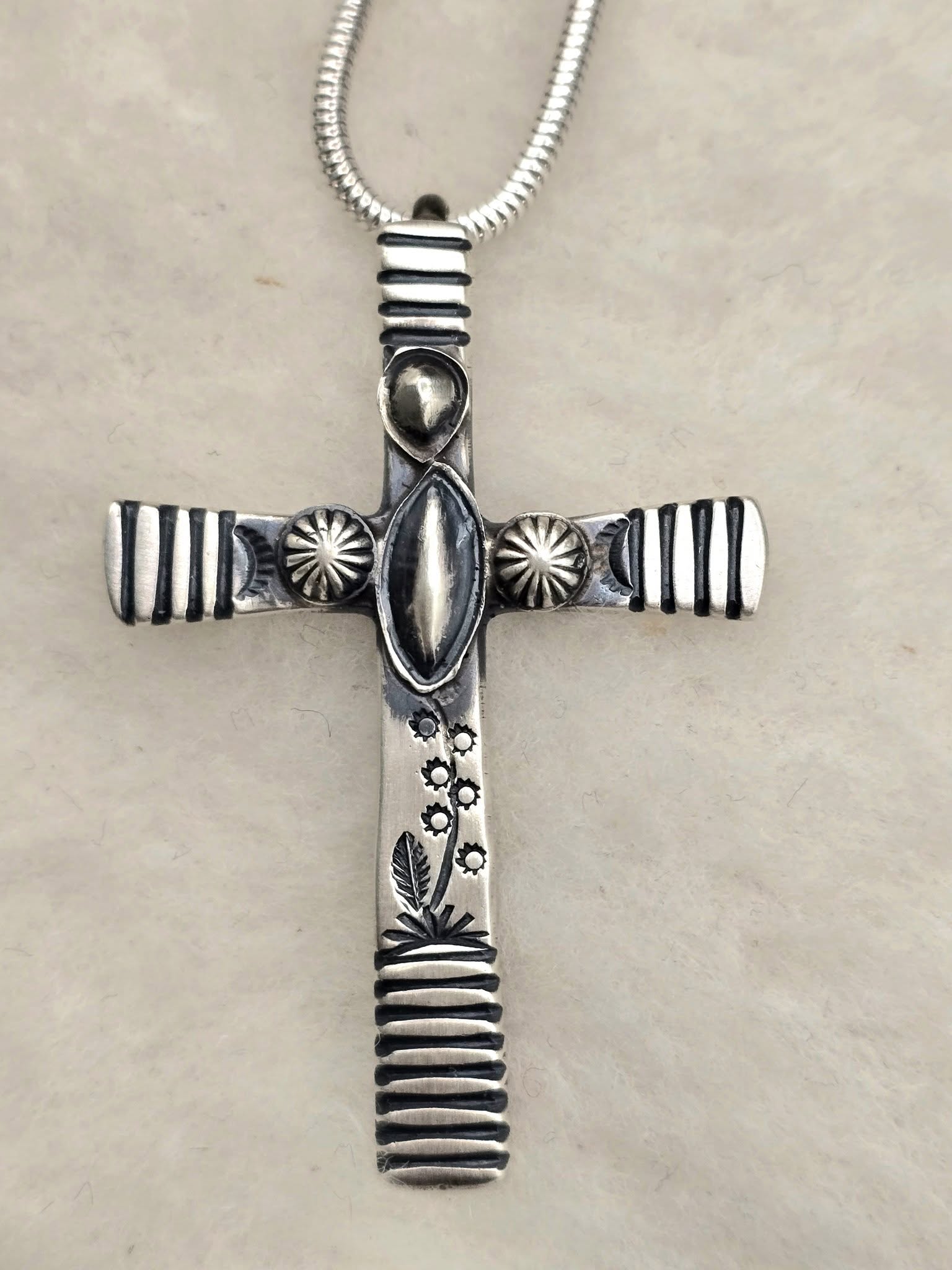 This cross was handmade by Mary Cayatineto, Navajo. Her work features traditional, intricate stampwork and sandcasting. Sterling silver. Her work is sought-after by collectors. Hallmarked with MC and Sterling. 2 1/2" long and 11/2"wide.